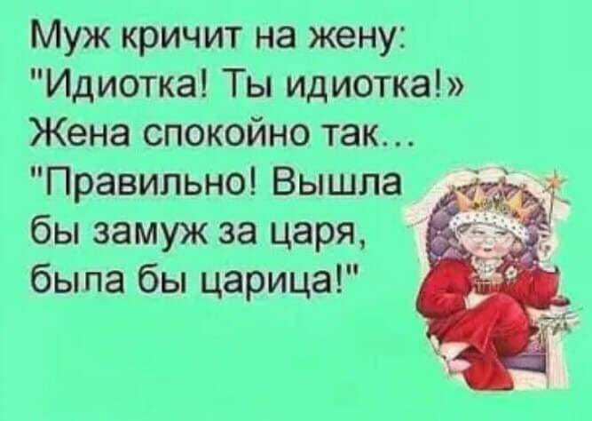 -Кашу не люблю, там пенка. Короче, я мужу сказала спокойно вечером вчера, надо было замуж за короля выходить, была б королева.....Все ж от женщины, правда? ....или я таки дура....скажи мне?